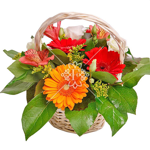 Лепестки красных и оранжевых гербер выглядят привлекательно и ярко, дополняет яркую гамму своей невесомостью и нежностью альстромерия в белом и оранжевом оттенке. Композиция оформлена в прекрасную цветочную корзинку, украшена декоративной зеленью с лимониумом и выглядит очень мило!